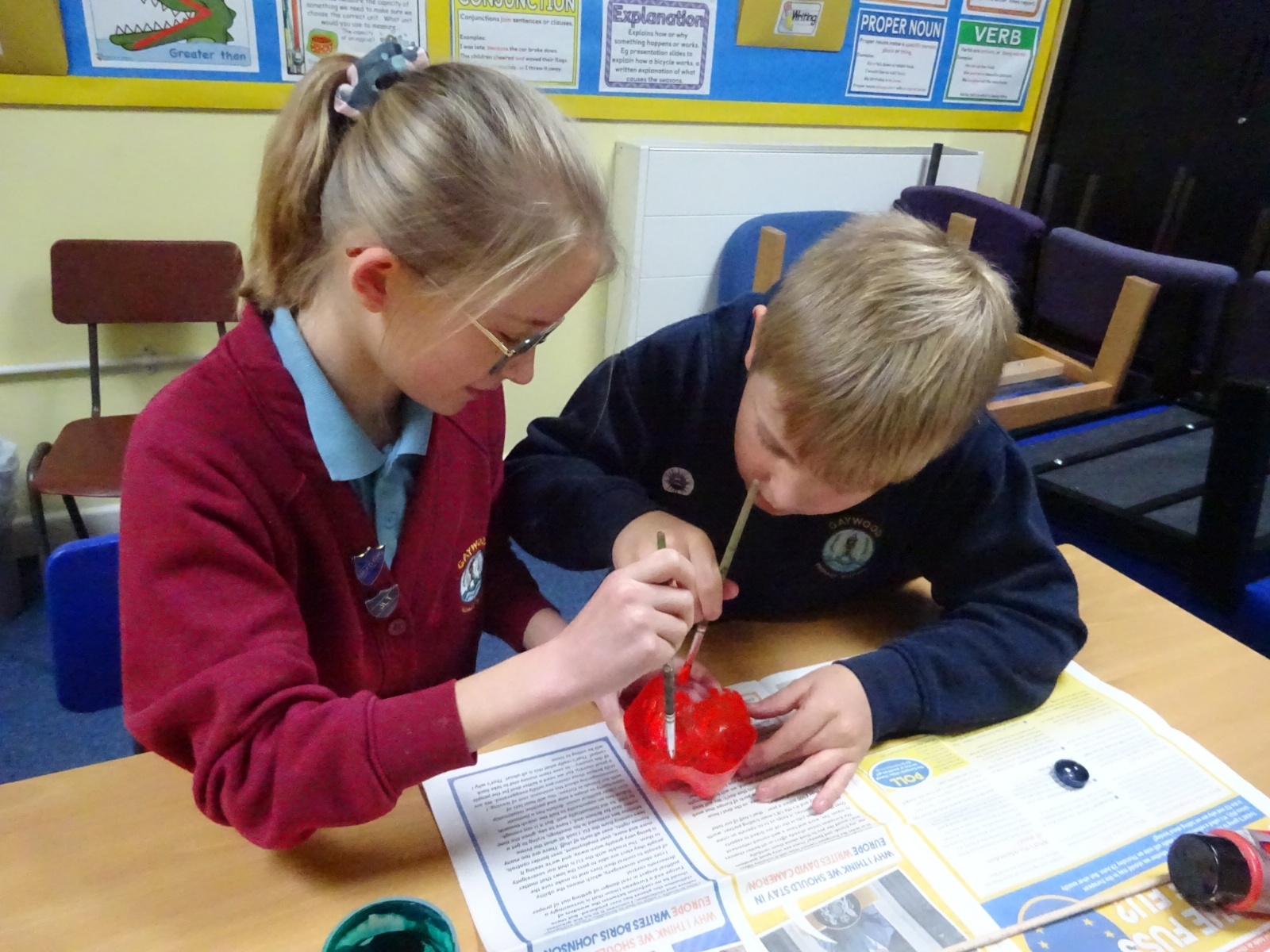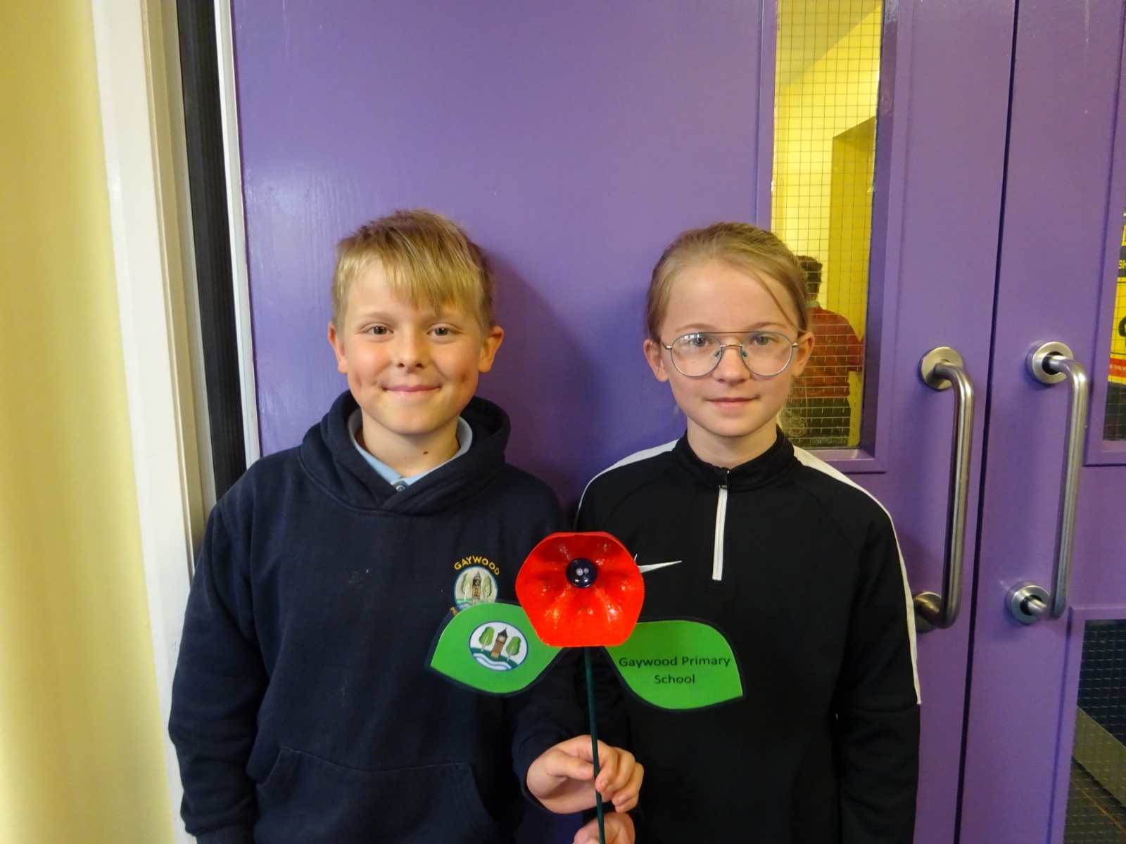 Our Head Boy and Head Girl making a poppy to represent our school.